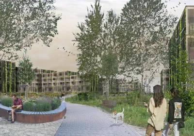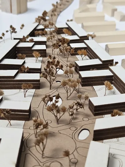 Der parkähnlich gestaltete Grünzug bietet eine hohe Lebensqualität für Menschen, Tiere und Pflanzen. Der Park ist beidseitig von Wohnblöcken eingefasst, die sich zur Quartiersmitte öffnen. Es entsteht ein fließender Übergang vom öffentlichen Park hin zu den privaten Innenhöfen.