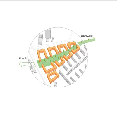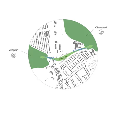 Das Konzept „Lebensader“ basiert auf einer zentralen grünen Zone aus, die sich durch das gesamte Quartier erstreckt und damit eine Verbindung des Oberwalds im Osten und der Alb im Westen darstellt.