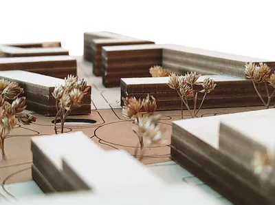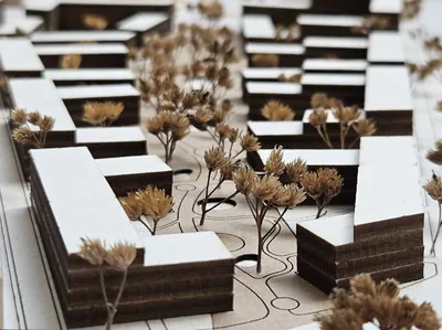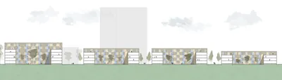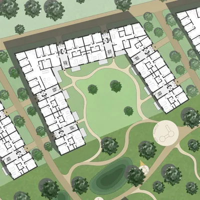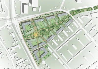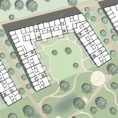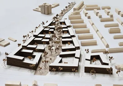 Der Grünzug ist beidseitig von Wohnblöcken eingefasst, die sich zur Quartiersmitte öffnen. Das Ergebnis ist eine Reihe von u-förmigen Gebäuden. Die „Flügel“ der Blöcke passen sich dem breiter werdenden Grünzug an. Daher haben sie keine rechten Winkel und sind nicht gleich lang.