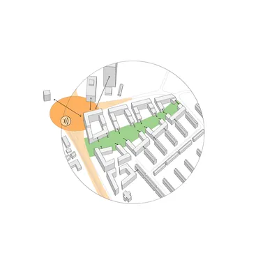 Die geschlossene Bauweise schützt zudem vor Lärmbelastung durch die große Verkehrskreuzung im Nordwesten. Dort befindet sich mit sieben Geschossen der höchste Punkt der Bebauung, der mit den benachbarten Hochhäusern interagiert. Zum Grünzug stufen sich die „Flügel“ der Gebäude auf drei Geschosse ab.