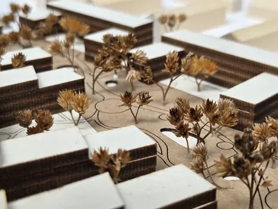 Die Innenhöfe sind privatisiert und für die Bewohner des jeweiligen Blocks bestimmt. Sie werden gemeinschaftlich genutzt und bilden somit einen Ort der Begegnung. Mithilfe der Bepflanzung wird ein fließender Übergang von dem dichten Bewuchs des Grünzugs bis hin zu einer lichteren Begrünung des Hofs geschaffen und damit der Unterschied zwischen dem öffentlichen und dem privaten Bereich ablesbar. Gleichzeitig kann der Grünzug auch als Erweiterung des eigenen Gartens gesehen werden.
