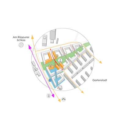 Beim Übergang zur Gartenstadt im Süden übernehmen die Blöcke mit ihren vier Geschossen die Höhe der angrenzenden Zeilenbauten. Die Seiten der Blöcke, welche zur Herrenalber Straße und zur Straße am Rüppurrer Schloss ausgerichtet sind, haben fünf Geschosse, um das Innere des Quartiers von den stark frequentierten Straßen abzugrenzen.