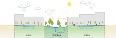 Durch das Sockelgeschoss ist es möglich, in den Gassen ein Gefälle zum Grünzug hin auszubilden. Entwässerungsrinnen fangen anfallendes Regenwasser auf und leiten es zum Park, wo es versickern kann.